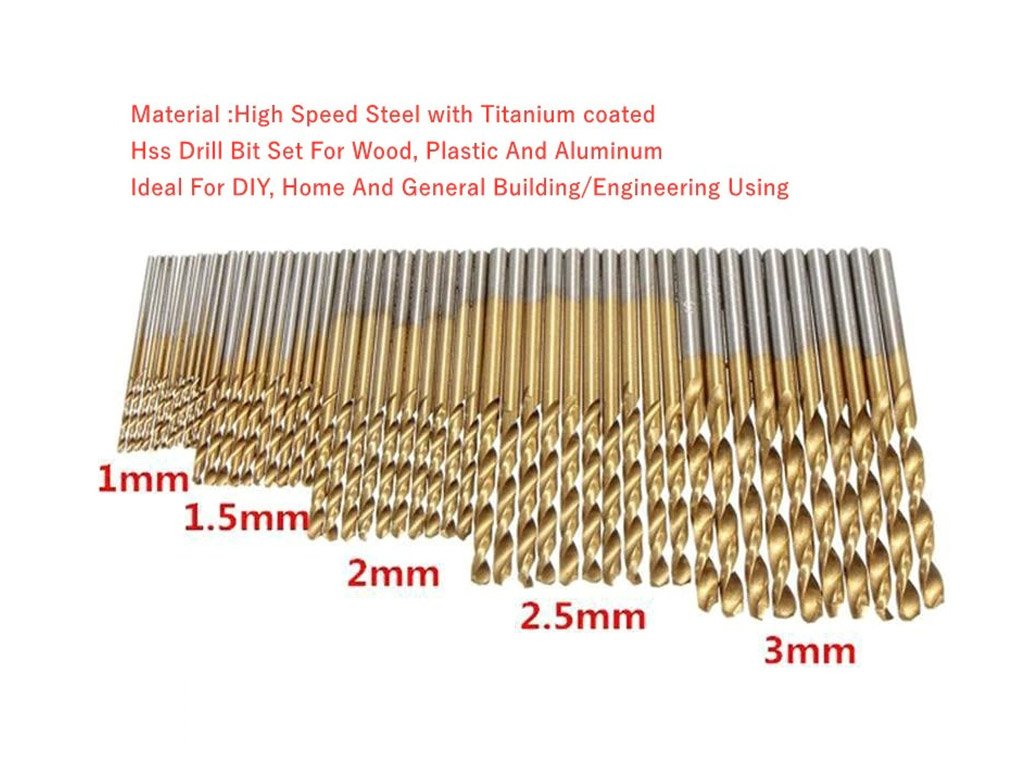 Juego de 100 / 200 brocas con recubrimiento de titanio de tamaños de 1 a 3 mm. Ideal para aficionados al bricolaje, hogares y uso general en edificios / ingeniería. Adecuadas para perforar agujeros en metal, especialmente hierro, acero, fundición gris y aleaciones de aluminio, latón, bronce.