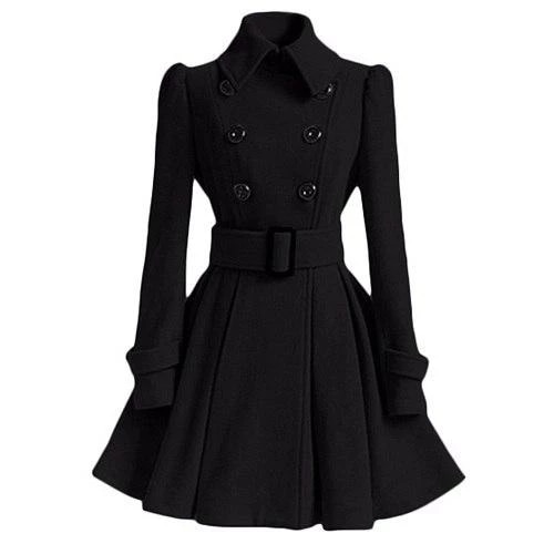Abrigo de moda con botones, cinturón y parte inferior en forma de A. (parte inferior ampliada)