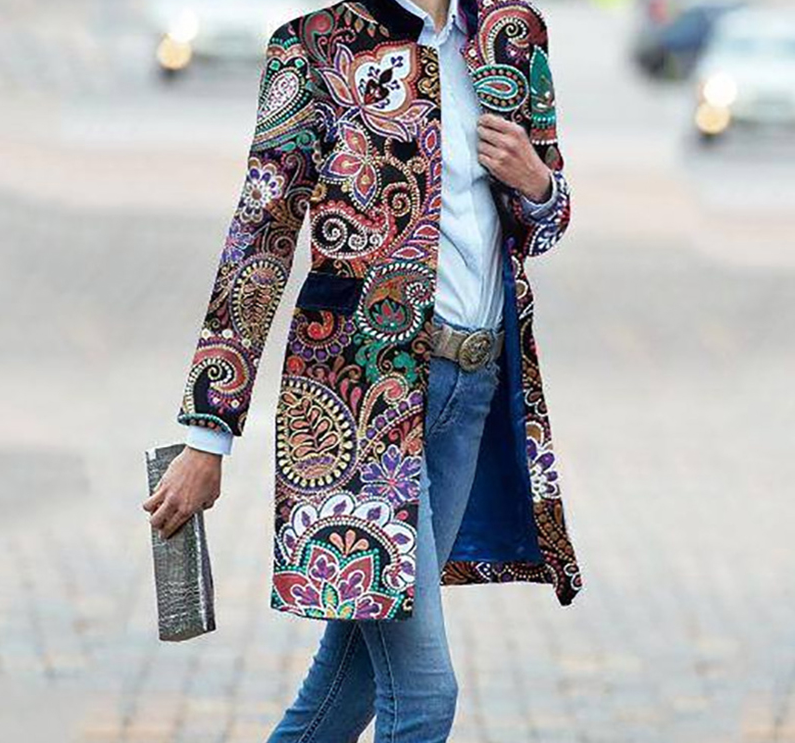 Abrigo elegante de primavera para mujer con estampados.