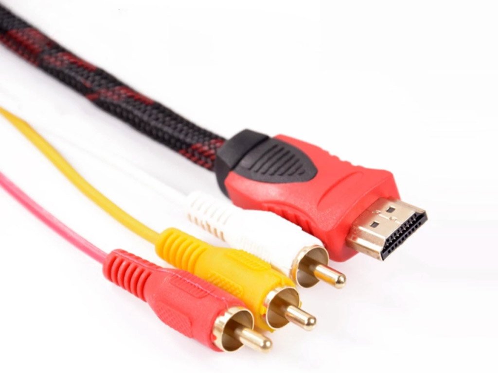 El cable sirve como adaptador para convertir la señal entre HDMI y 3 cables RCA. La parte HDMI del cable cuenta con un conector macho.