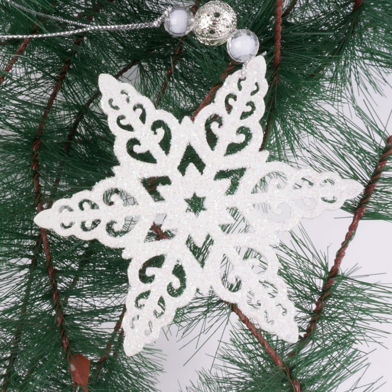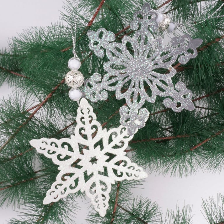 Conjunto de adornos navideños colgantes en forma de copo de nieve.