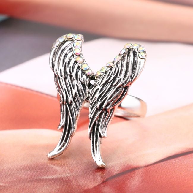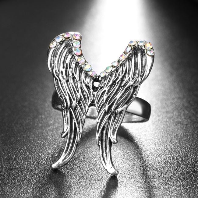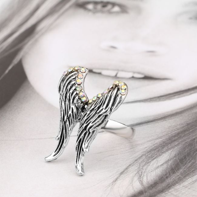 El anillo está decorado con alas y piedras. Elija entre varias tallas.