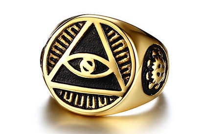 Este anillo está decorado con el símbolo del Ojo de Dios en un triángulo adornado con rayos.