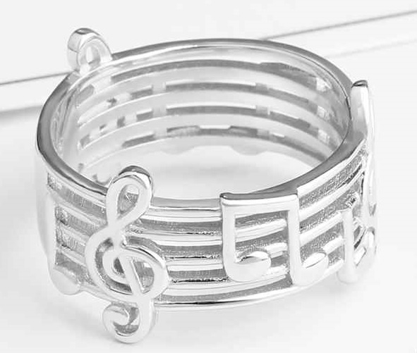 Este anillo estiloso, completamente de plata y con notas musicales, está aquí para ti a un precio especial.
