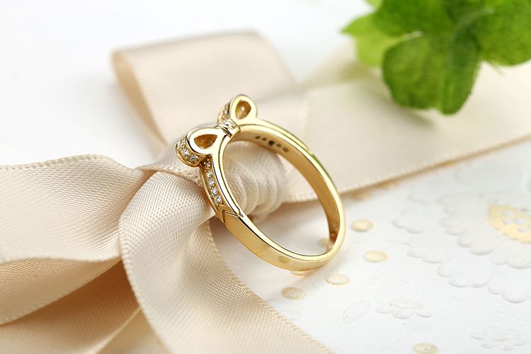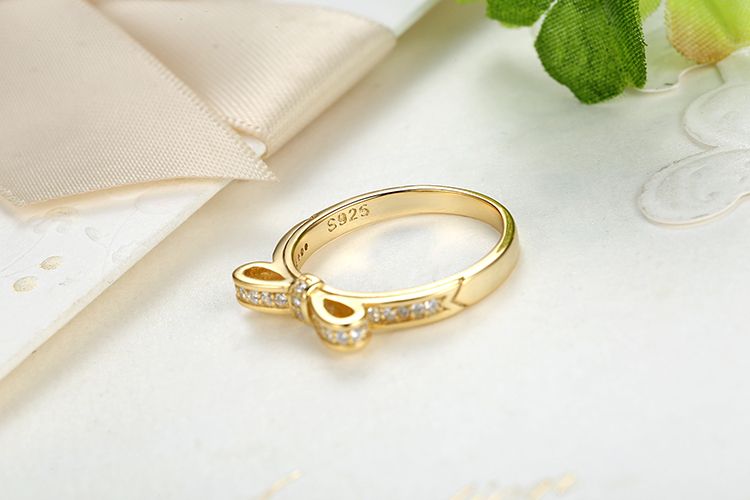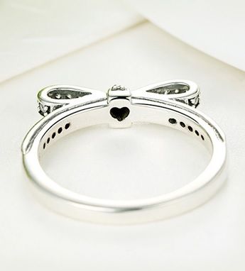 Un lazo muy discreto y pequeño adornado con circonitas es una hermosa decoración de este anillo.