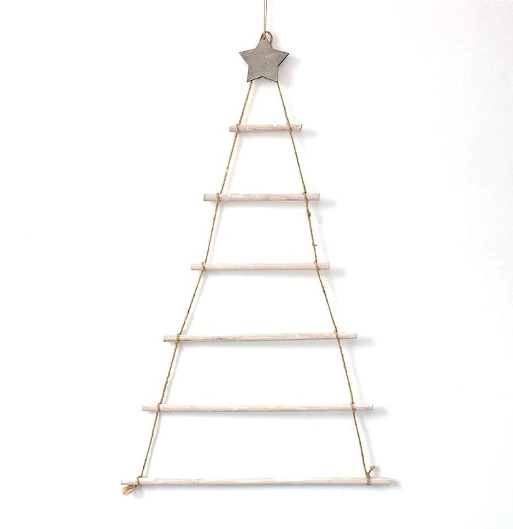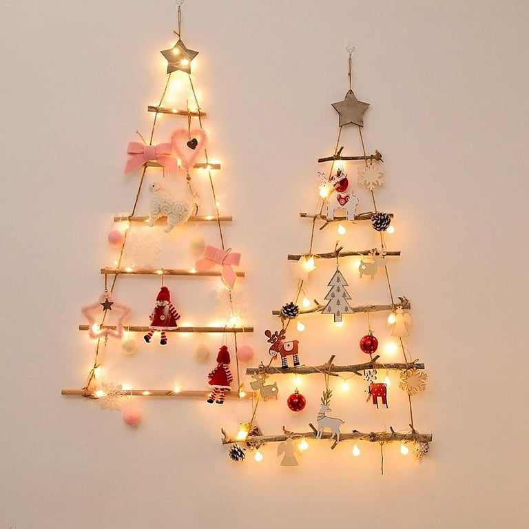 Hermoso árbol de Navidad hecho de ramas de madera para colgar en la pared.