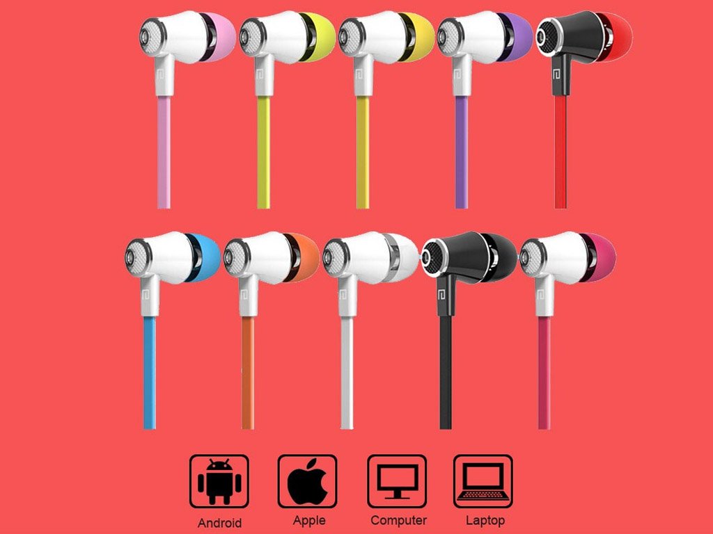 Auriculares con cables planos de 1.2 metros de longitud en 10 colores diferentes.