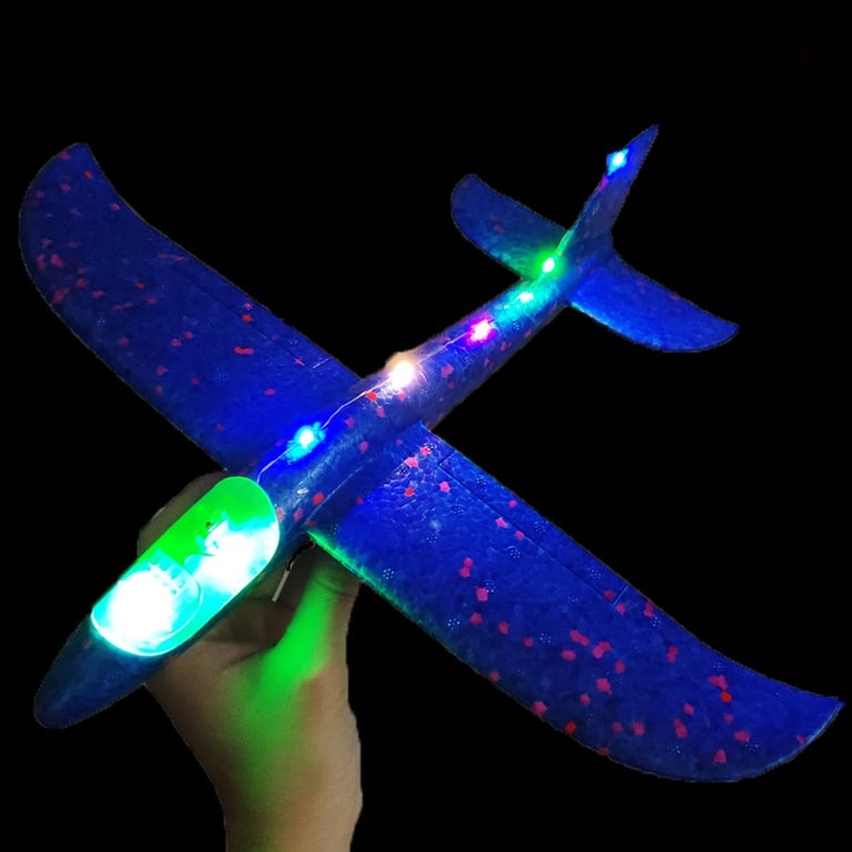 Aeroplano de espuma para lanzar para niños con luces LED en la parte superior. El tamaño del avión una vez plegado es de 35 x 30 cm.