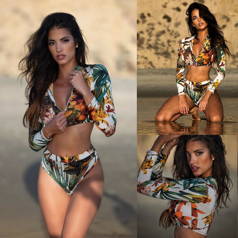 Bañador de dos piezas de verano para mujer con estampado tropical y mangas largas.
