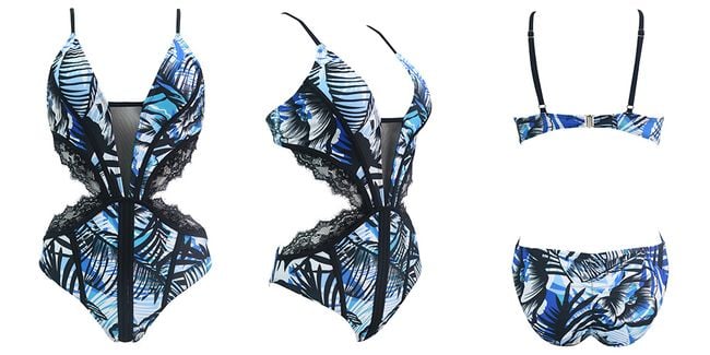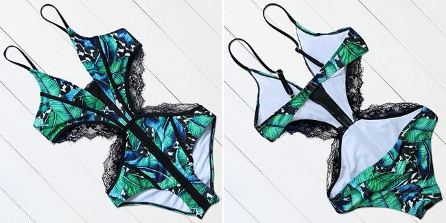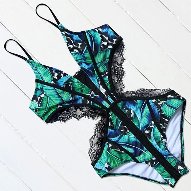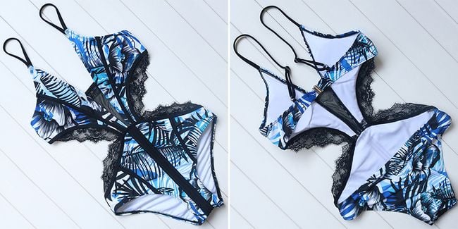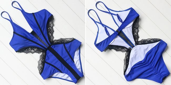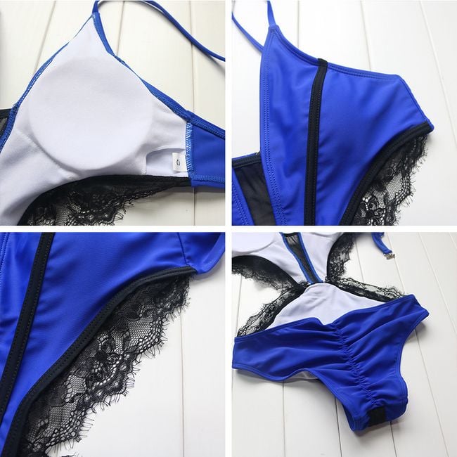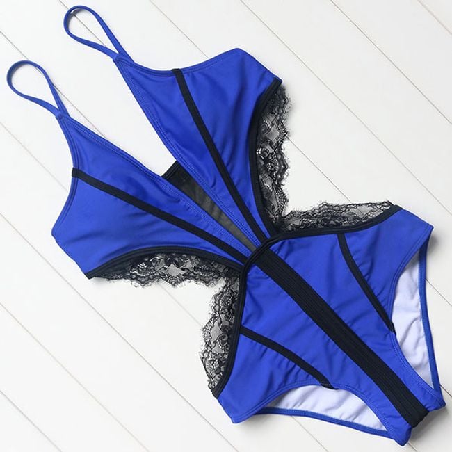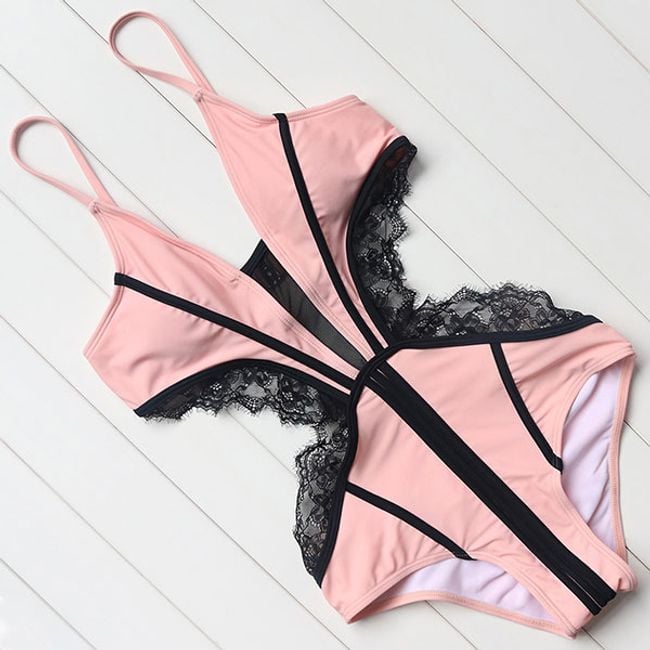 Este traje de baño de una pieza tiene cortes en los lados, decorados con encaje negro. La zona del busto está reforzada. Las tirantes son ajustables. Tienes varias combinaciones de colores y tamaños para elegir.