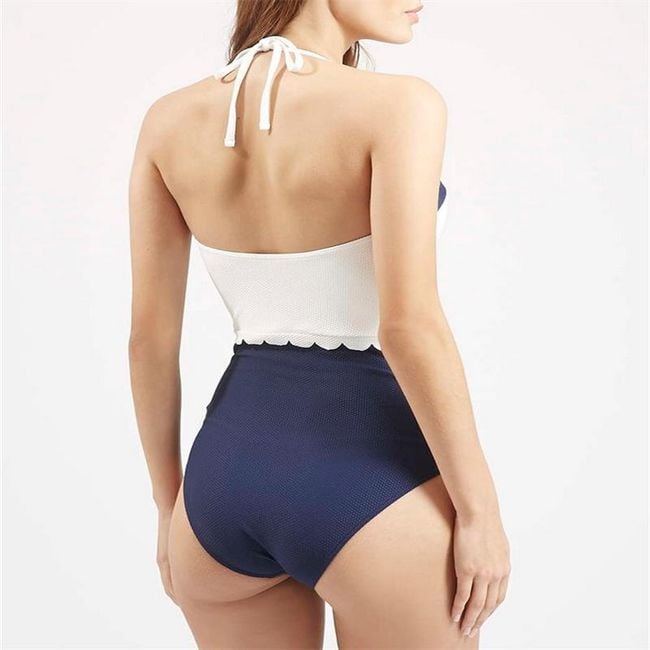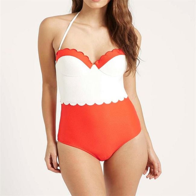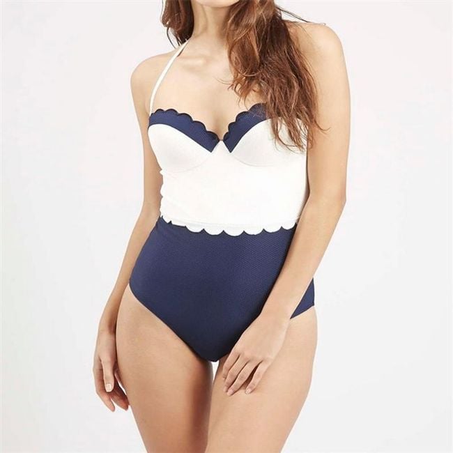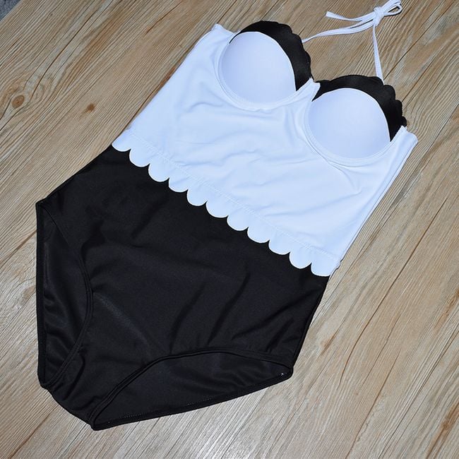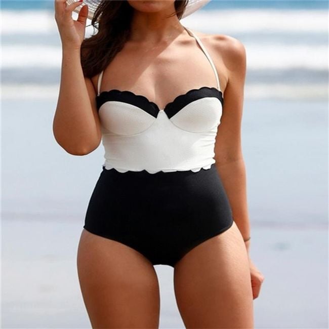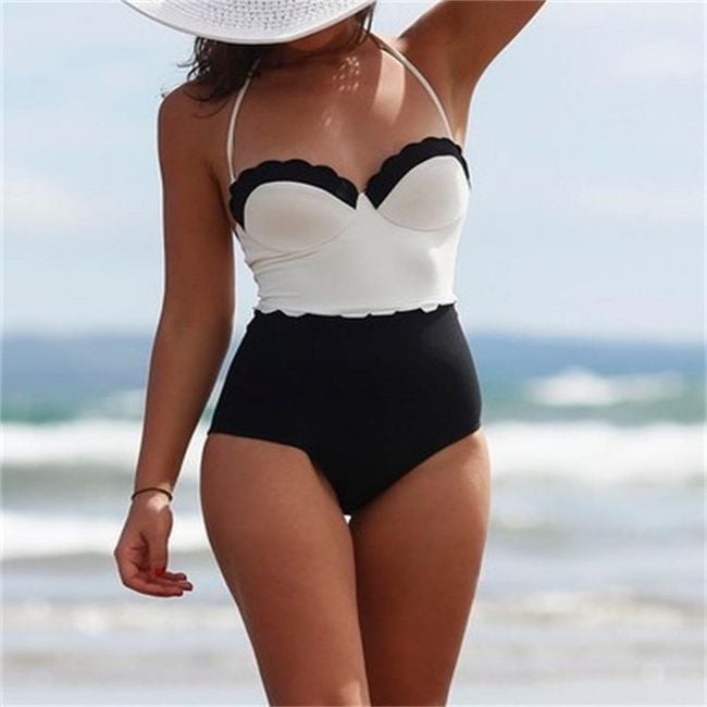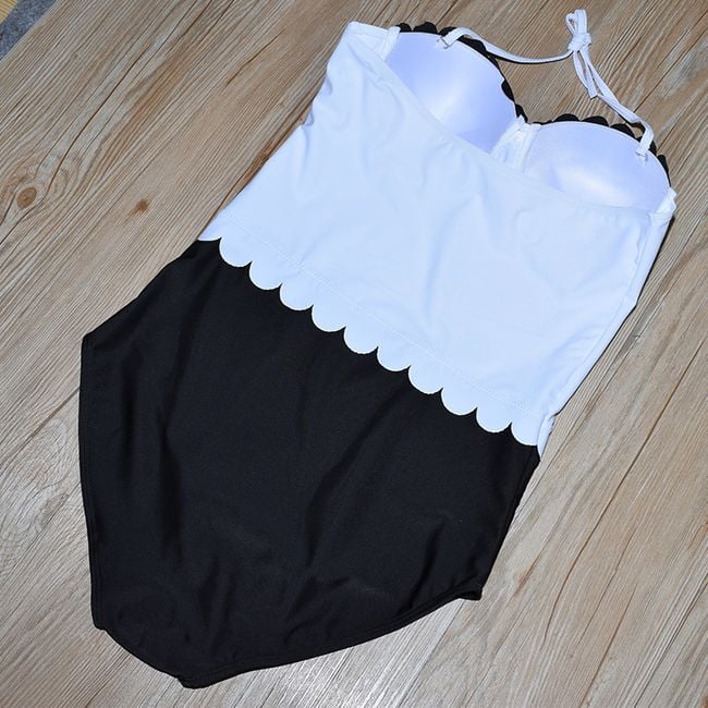 Las copas push up y la cintura de este traje de baño de una sola pieza están decoradas con ondas de otro color. La tira detrás del cuello es delgada. Tienes varias opciones de colores y tamaños.