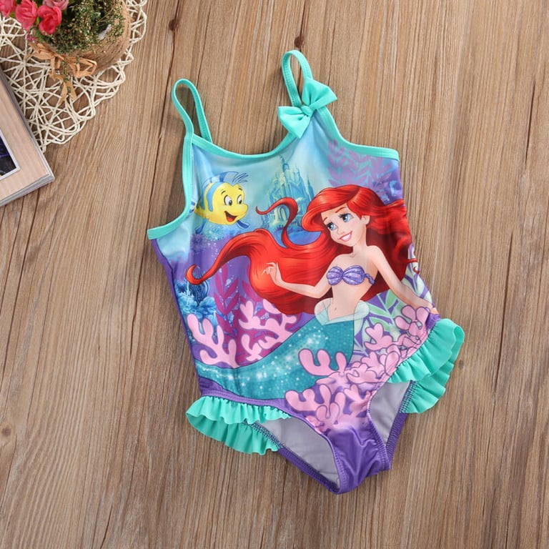 • Traje de baño de una pieza para niña decorado con un estampado de la popular sirena Ariel, volantes y un lazo en la tirante.