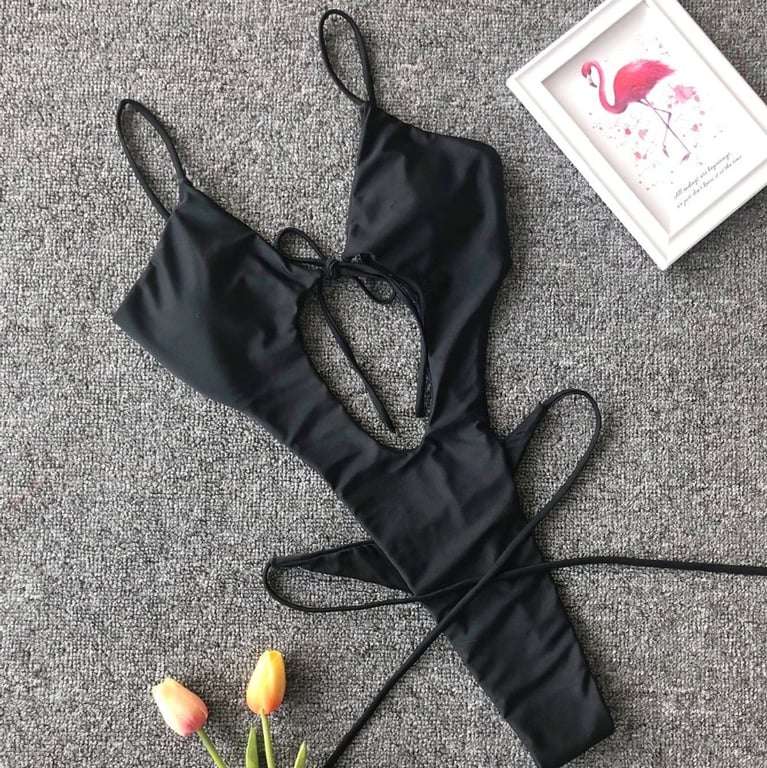 Con este traje de baño definitivamente atraerás la atención de muchas personas. Es muy atrevido y muy sexy. Hay varias opciones de color. El traje se ata y la parte inferior está diseñada como un tanga. En la parte delantera hay un corte que te permitirá mostrar tu abdomen y el sujetador también tiene un lazo en la parte delantera.