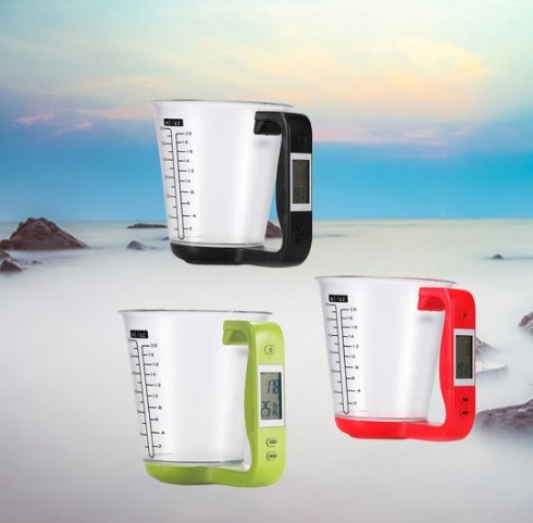 Báscula digital con taza medidora. Puedes pesar los alimentos o medir la cantidad usando la taza medidora.