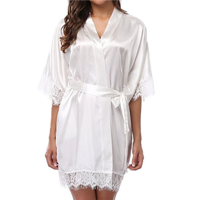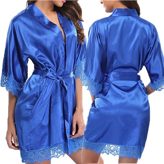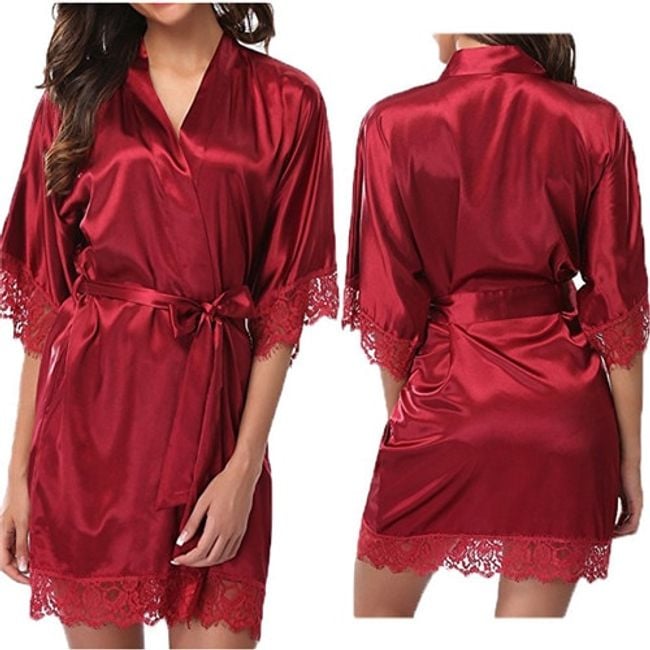 El albornoz de satén de un solo color tiene bordes decorados con encaje.