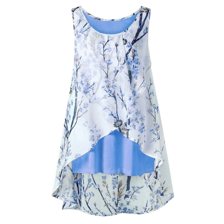 Blusa sin mangas para mujer con tirantes anchos y escote redondo. Con top interior cosido. Corte asimétrico y suelto. Estampado colorido con flores. Tallas grandes. Disponible en varias opciones.