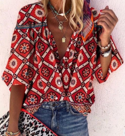 Blusa boho femenina suelta con hermoso estampado rojo.