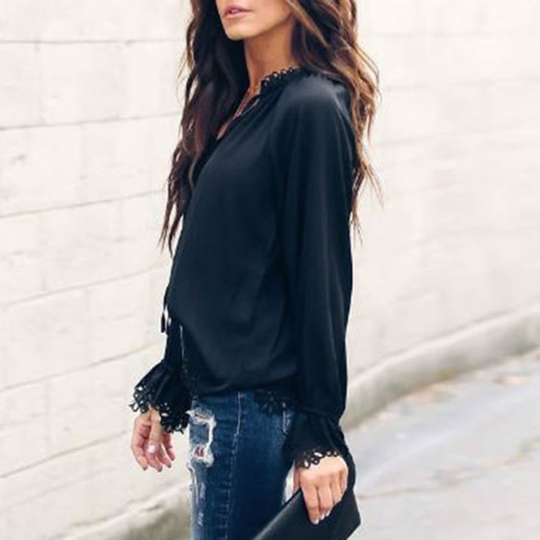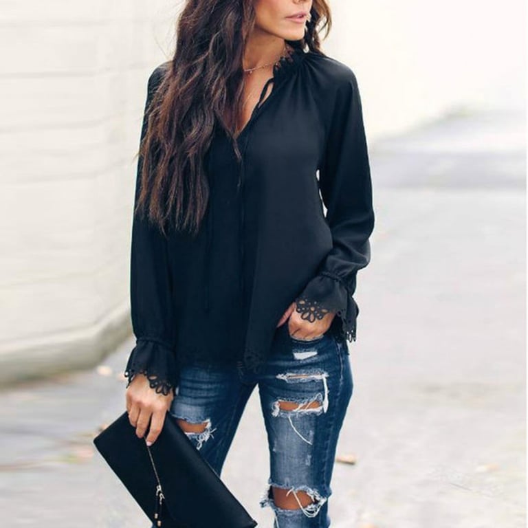 Blusa de chiffon para mujer con mangas largas. La blusa tiene un escote en forma de V con cordones. Corte holgado. Material ligero y suave. Disponible en dos variantes.