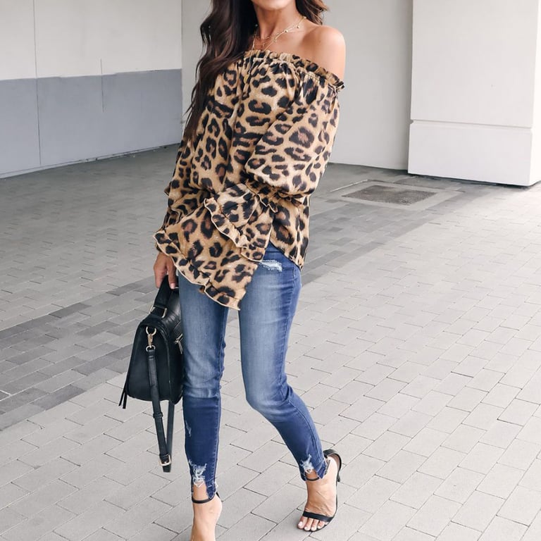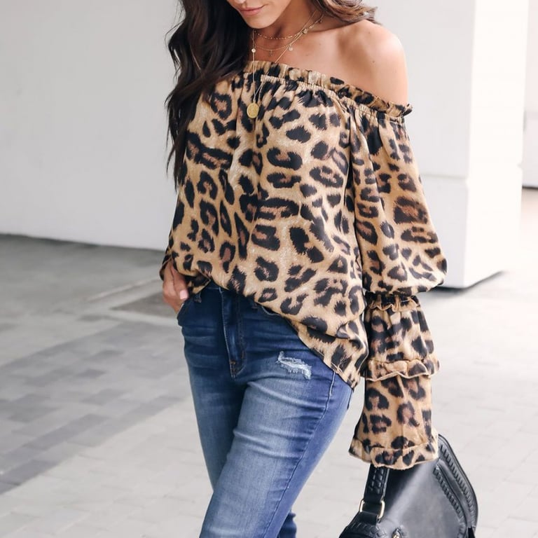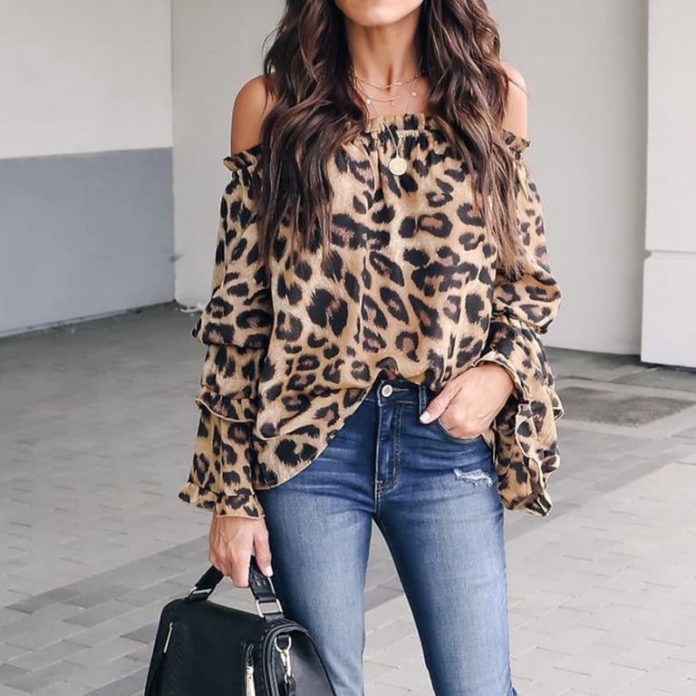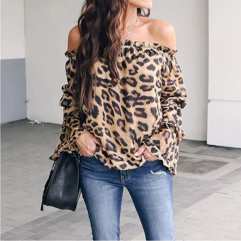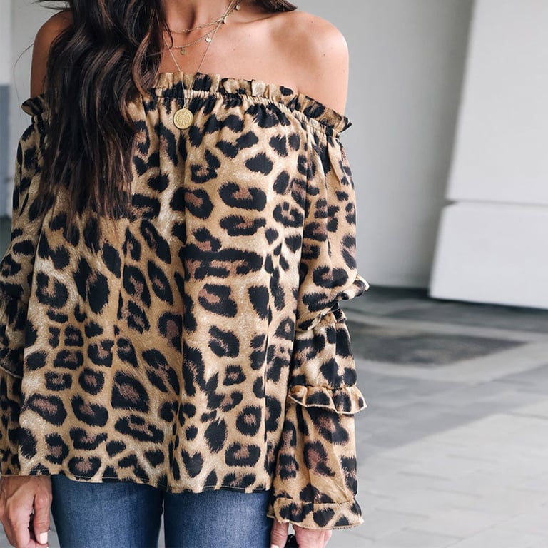 Blusa de mujer con mangas largas y acampanadas con volantes. La blusa tiene un escote con hombros descubiertos y un corte holgado. Estampado con patrón de leopardo.
