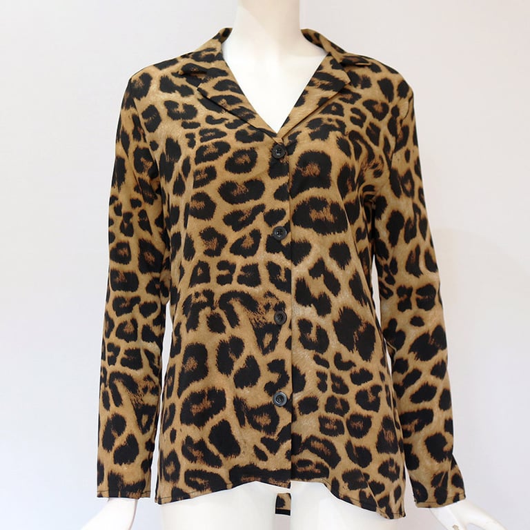 Blusa de mujer con cuello y mangas largas. Cierre de botones. Estampado con patrón animal. Disponible en varias opciones de color.