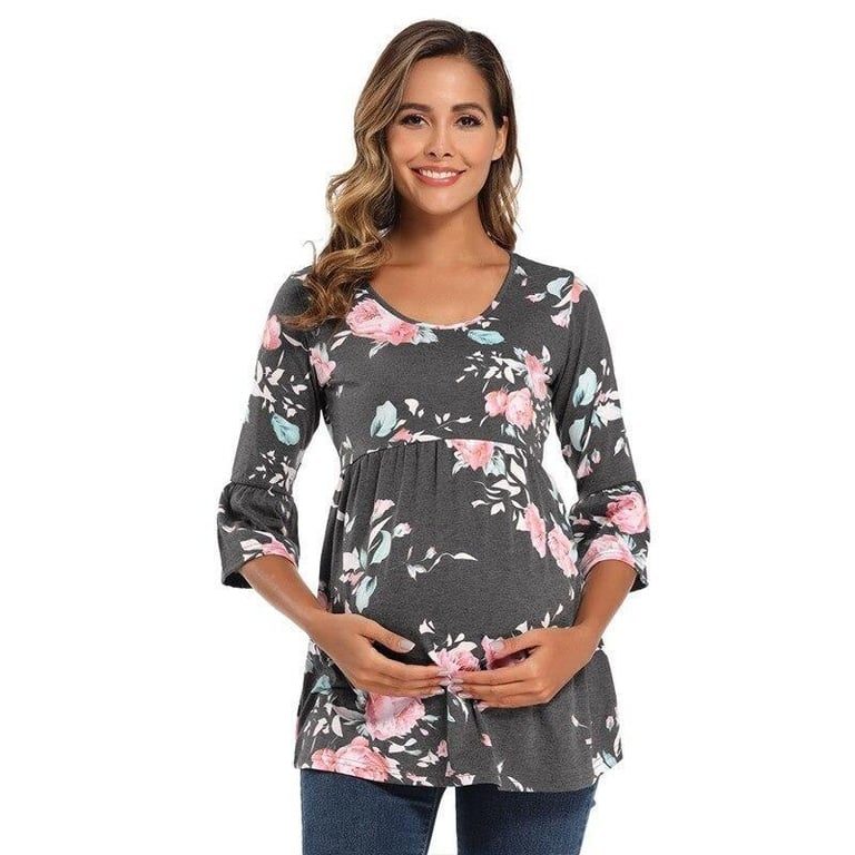 Bonita blusa de maternidad para mujer con mangas 3/4, volantes y estampado floral. También es adecuada como camiseta de lactancia.