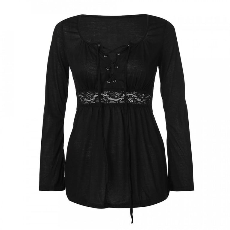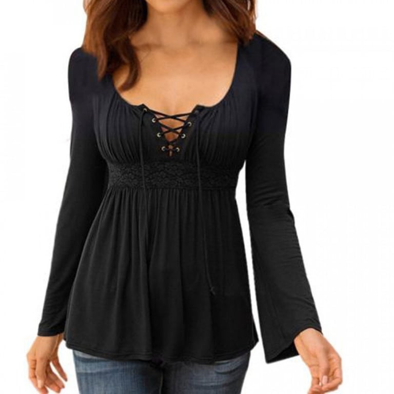 Blusa de mujer con mangas largas y amplias y escote en V con cordones. Corte holgado con ajuste debajo del busto. Tallas grandes disponibles. Varias opciones para elegir.