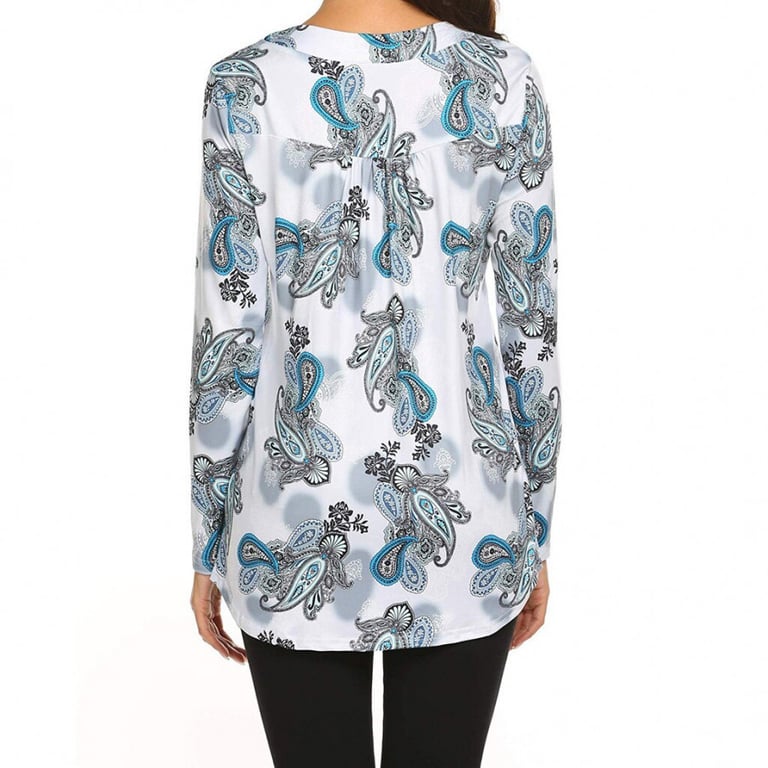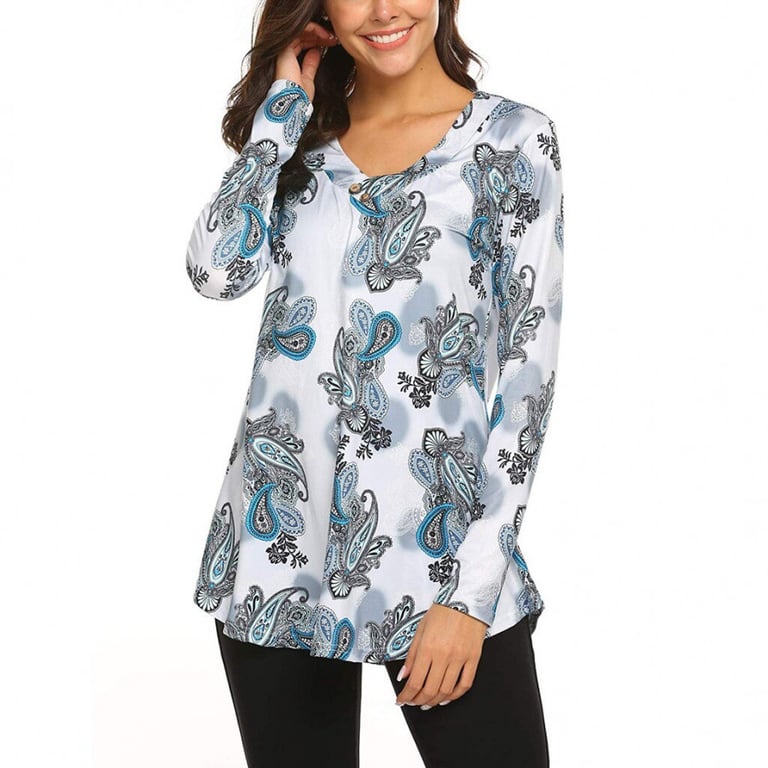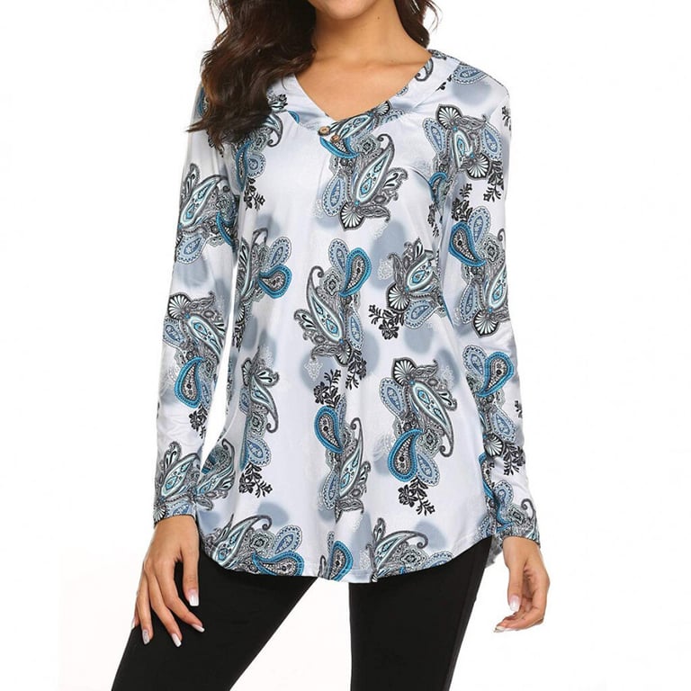Blusa de mujer con un patrón colorido. Manga larga y escote en V con botones decorativos. Corte holgado.