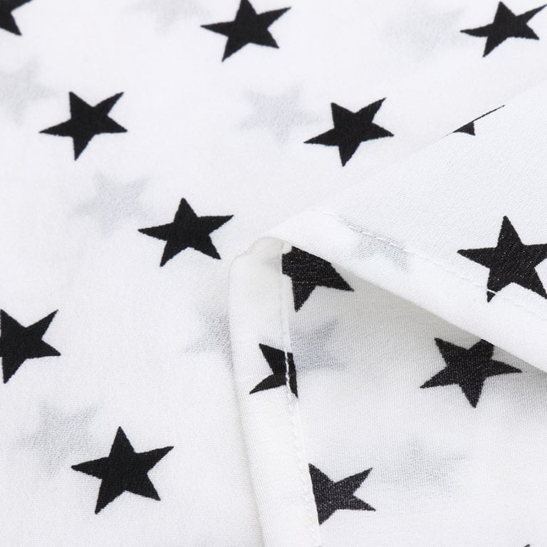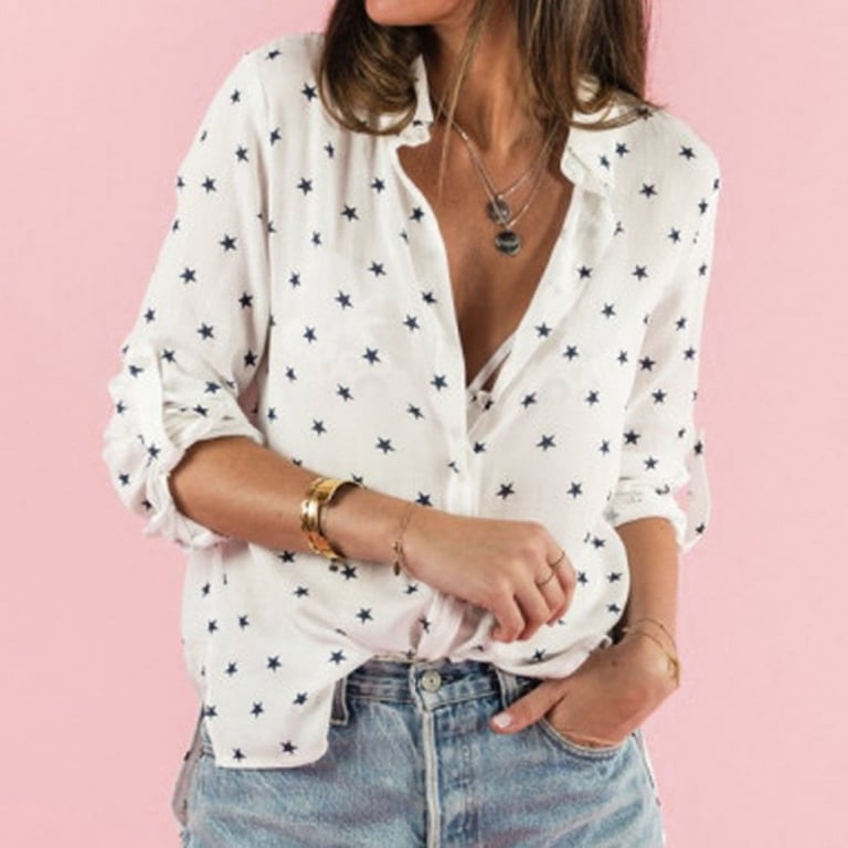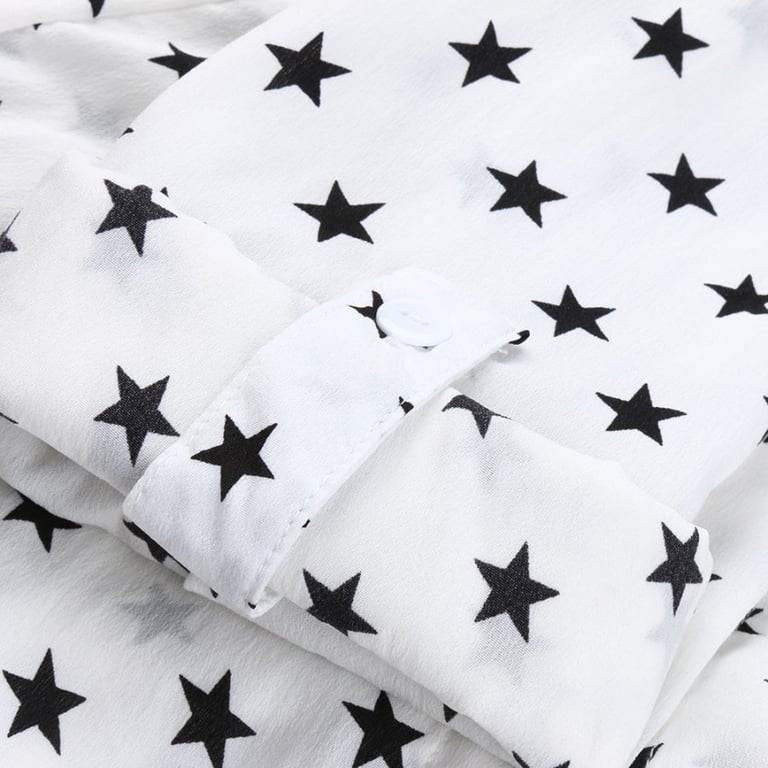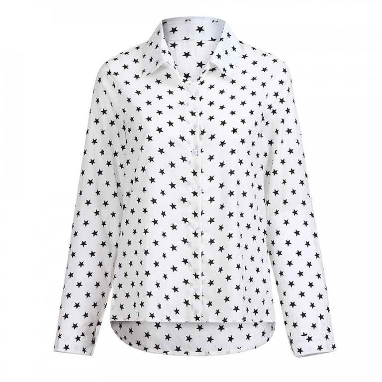 Blusa de camisa para mujer con cuello y mangas largas. La blusa tiene un cierre de botones. Corte holgado y cómodo. Blanca con estampado de pequeñas estrellas.