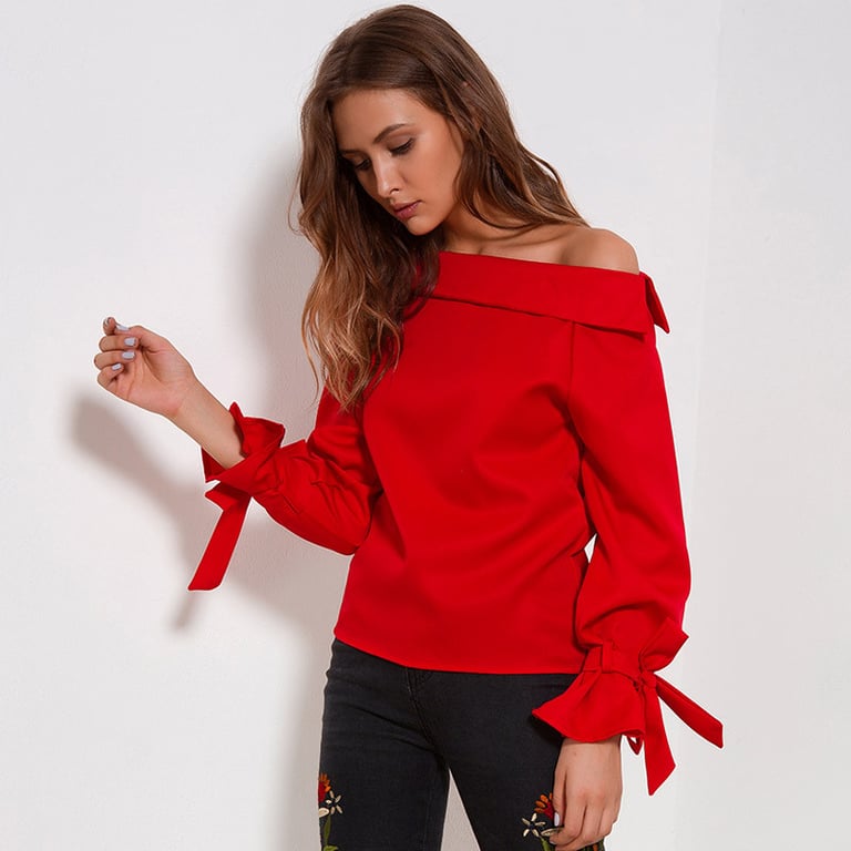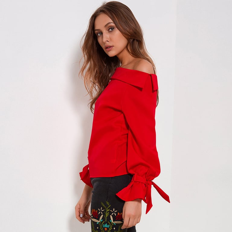 Sudadera de mujer de manga larga con ajuste de lazo. La sudadera es de un brillante color rojo y tiene un escote con los hombros al descubierto.