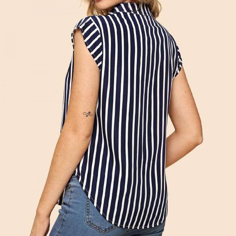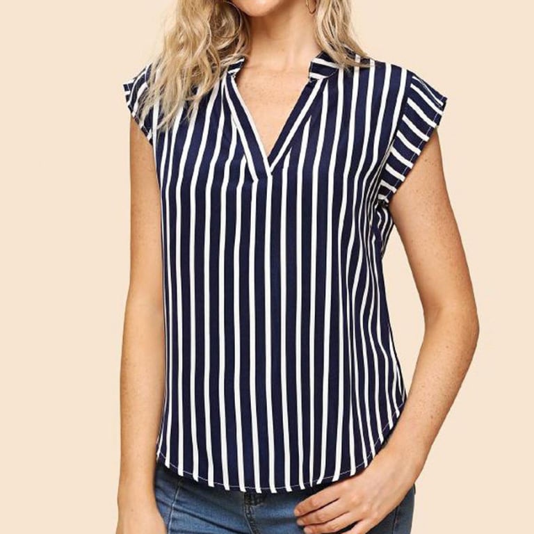 Blusa elegante para mujer con un patrón de finas rayas. La blusa tiene mangas cortas y un escote en forma de V con un cuello bajo. Corte recto y suelto.