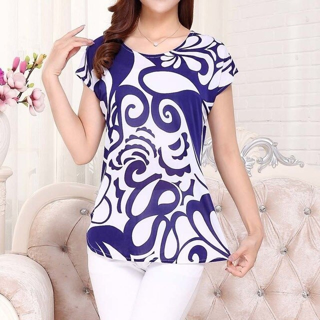 Blusa de mujer con mangas cortas y escote redondo. La blusa tiene un corte holgado y un estampado con un motivo floral colorido. Disponible en varias opciones.