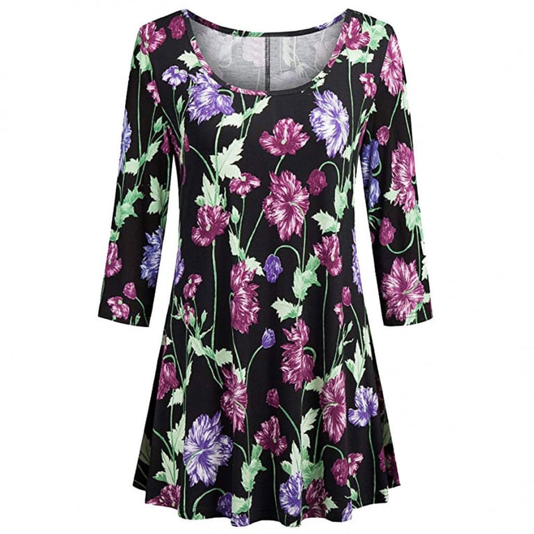 Blusa de mujer con mangas 3/4 y escote redondo. Corte ajustado y más largo. Estampado con un patrón colorido.