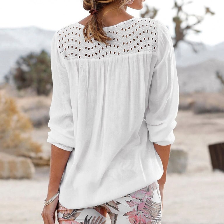 Blusa de mujer con escote, decoración de perforaciones y cordones. Manga larga tipo globo. Corte suelto con fruncidos.