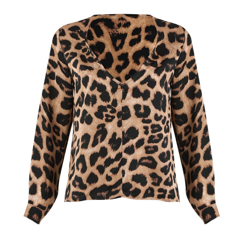Blusa de mujer con estampado de leopardo. La blusa tiene un corte holgado, mangas largas y un escote en V profundo.