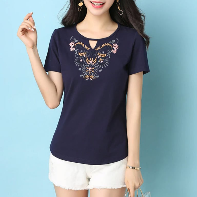 Blusa de mujer con mangas cortas y escote redondo. Corte recto y suelto con bordado en la parte delantera. Varias opciones de color.