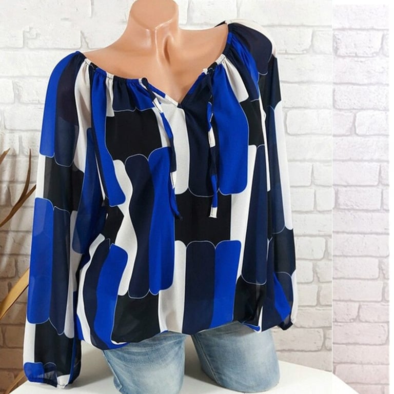 Blusa de mujer con escote y hombros al descubierto y con cordones. Corte suelto con mangas largas. Estampado con un patrón colorido. Disponible en varias opciones.