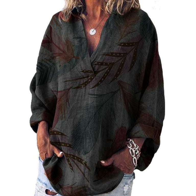 Blusa de mujer con estampado de hojas. Corte holgado con mangas 3/4 y escote en V. Disponible en varias opciones de color.