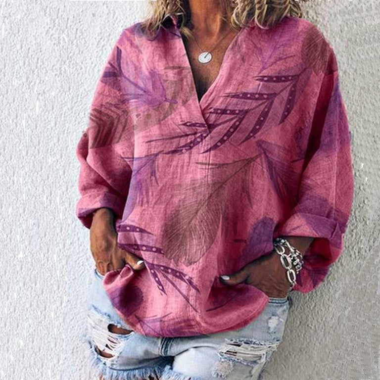 Blusa de mujer con estampado de hojas. Corte holgado con mangas 3/4 y escote en V. Disponible en varias opciones de color.