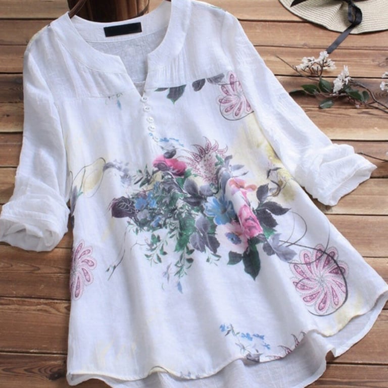 Blusa tunicada para mujer con escote redondo y mangas largas. Corte suelto y más largo. Estampado colorido con motivo floral. Disponible en varias opciones.