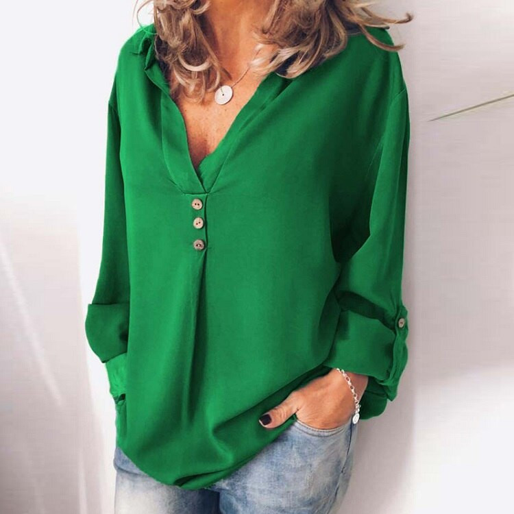 Blusa de mujer de manga larga. La blusa tiene un corte suelto y cómodo con escote en V y botones. Disponible en varias opciones de color.