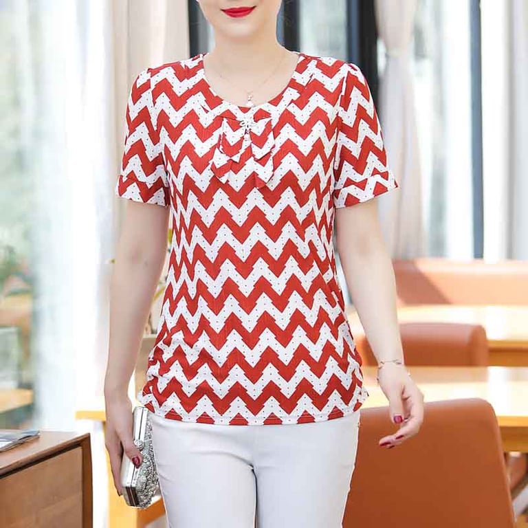 Blusa de mujer con mangas cortas y corte holgado. La blusa tiene un estampado con un patrón colorido y un escote con volantes. Disponible en varias opciones.