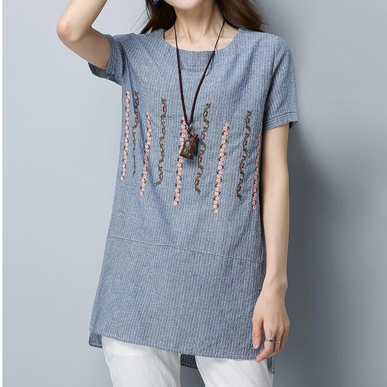 Blusa de mujer con mangas cortas y escote redondo. Corte holgado con un delicado patrón y bordado en la parte delantera. Disponible en dos colores.