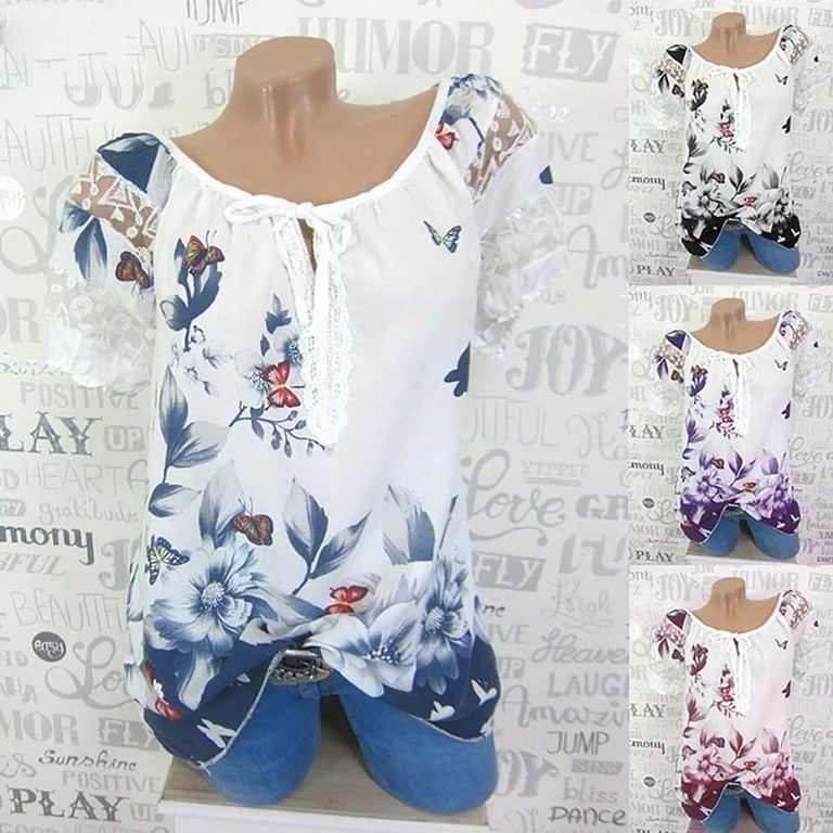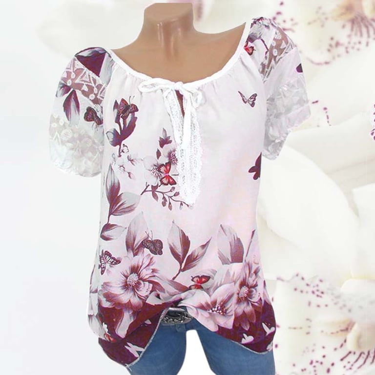Hermosa blusa con un diseño de flores y mariposas, que está agradablemente adornada con un delicado encaje. ¡El envío es completamente gratis al realizar el pedido!