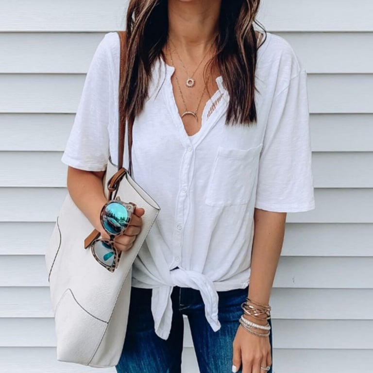 Blusa de mujer con mangas cortas y escote en V. Corte holgado con cierre de botones y detalle de nudo.