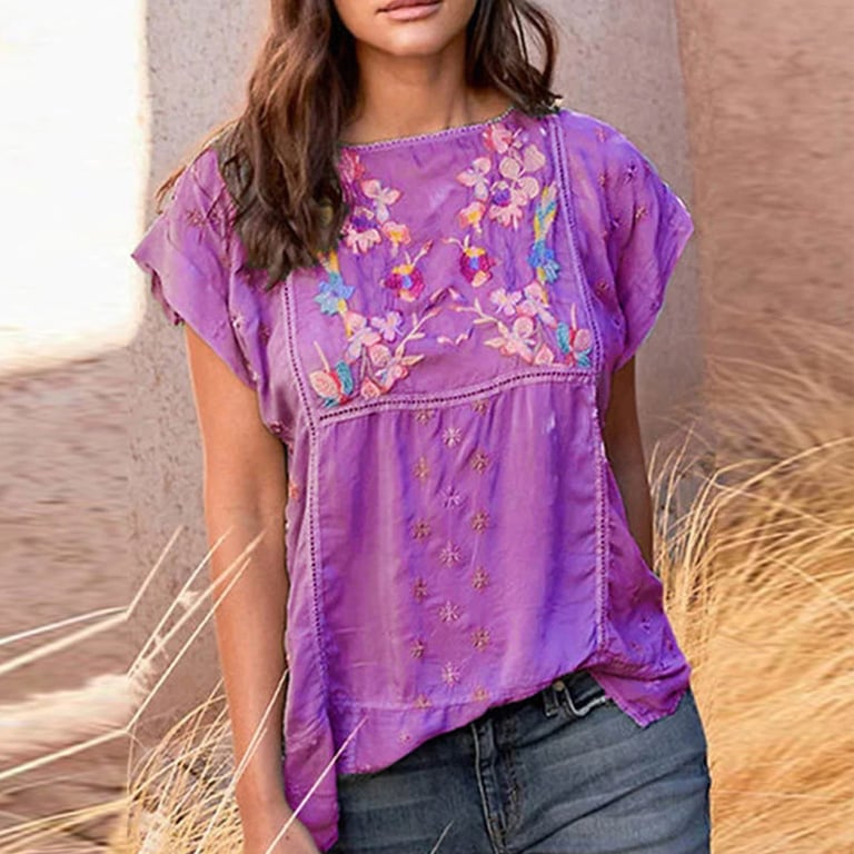Blusa de mujer con bordado floral. La blusa tiene mangas cortas y escote barco. Corte suelto con entallado debajo del busto. Disponible en varias opciones de color.