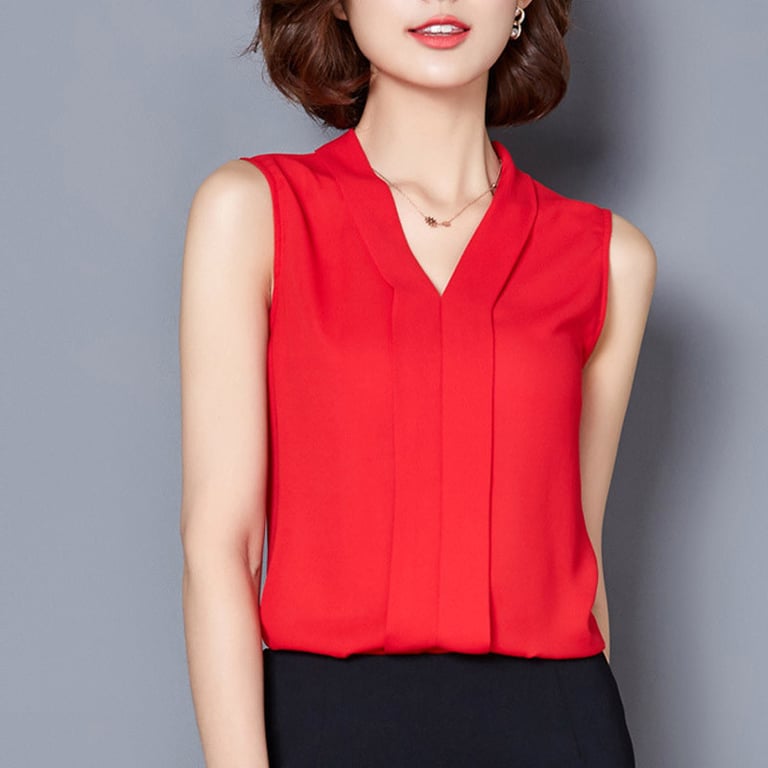Blusa elegante sin mangas para mujer. Corte suelto con escote en V y cuello. Disponible en varias opciones de color.