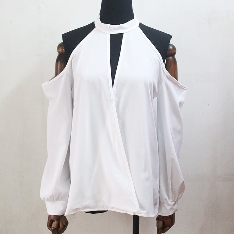Hombros descubiertos, escote ligero y mangas largas y sueltas.