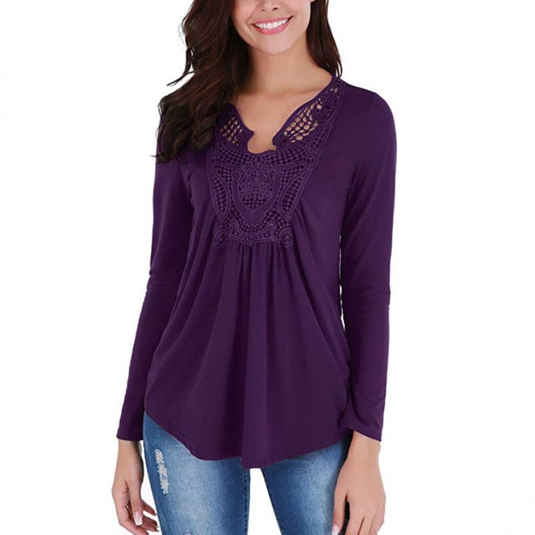Blusa de mujer con mangas largas y escote adornado con encaje. Corte suelto ligeramente entallado. Disponible en varias opciones de color.