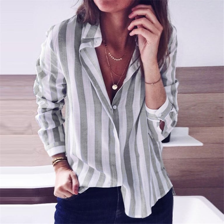 Blusa de camisa para mujer con patrón a rayas y manga larga. La blusa tiene un corte holgado, escote en V con cuello y cierre de botones. Disponible en varias opciones de color.