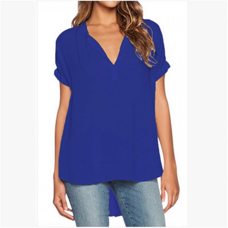 Blusa de chiffon para mujer con mangas cortas y escote en V con cuello. Corte asimétrico suelto. Material ligero y agradable. Tallas grandes disponibles. Disponible en varias opciones de color.